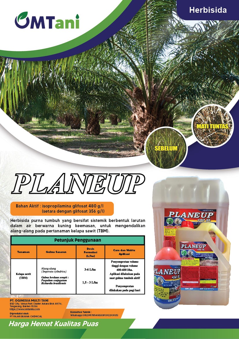 Deskripsi: Planeup 480 SL adalah pupuk herbisida unggulan dari OMTani yang dirancang untuk memberikan solusi efisien dan efektif dalam pengelolaan gulma di lahan pertanian. Produk ini mengandung bahan aktif berkualitas tinggi yang bekerja cepat dan tepat sasaran, memastikan hasil panen yang optimal tanpa gangguan gulma.